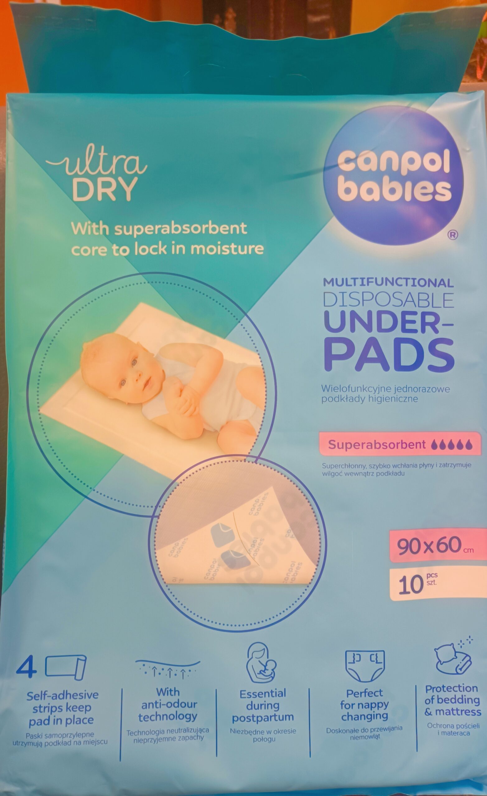 Bardzo chłonne podkłady, które błyskawicznie zatrzymują wilgoć wewnątrz i neutralizuje zapachy. Duży rozmiar zapewnia doskonałą ochronę powierzchni. Posiadają 4 paski samoprzylepne, dzięki którym podkład nie przesuwa się na materacu czy przewijaku. Wymiary 90×60 cm.