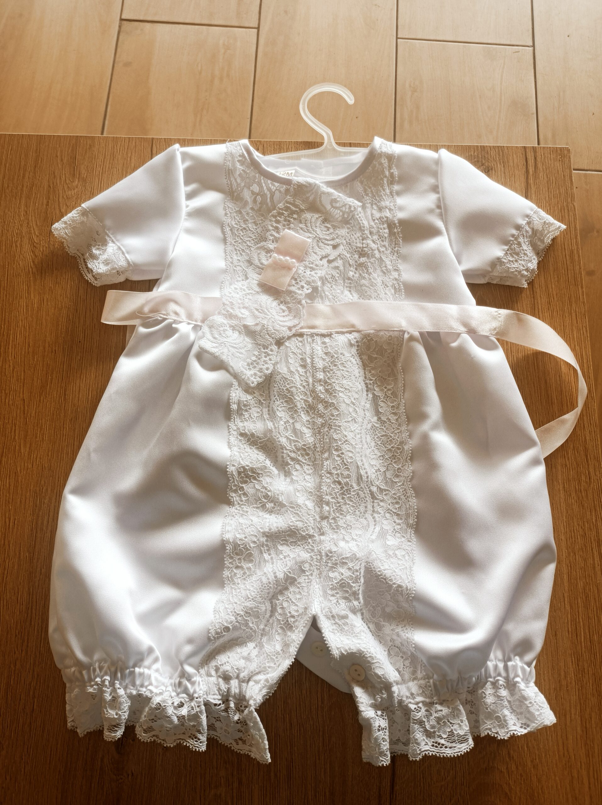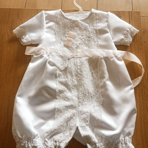 Biały kombinezon niemowlęcy typu rampers z krótkimi rękawami i bufkami. Eleganckie ubranko, które z powodzeniem może służyć jako strój chrzcielny lub na inną rodzinną celebrację
