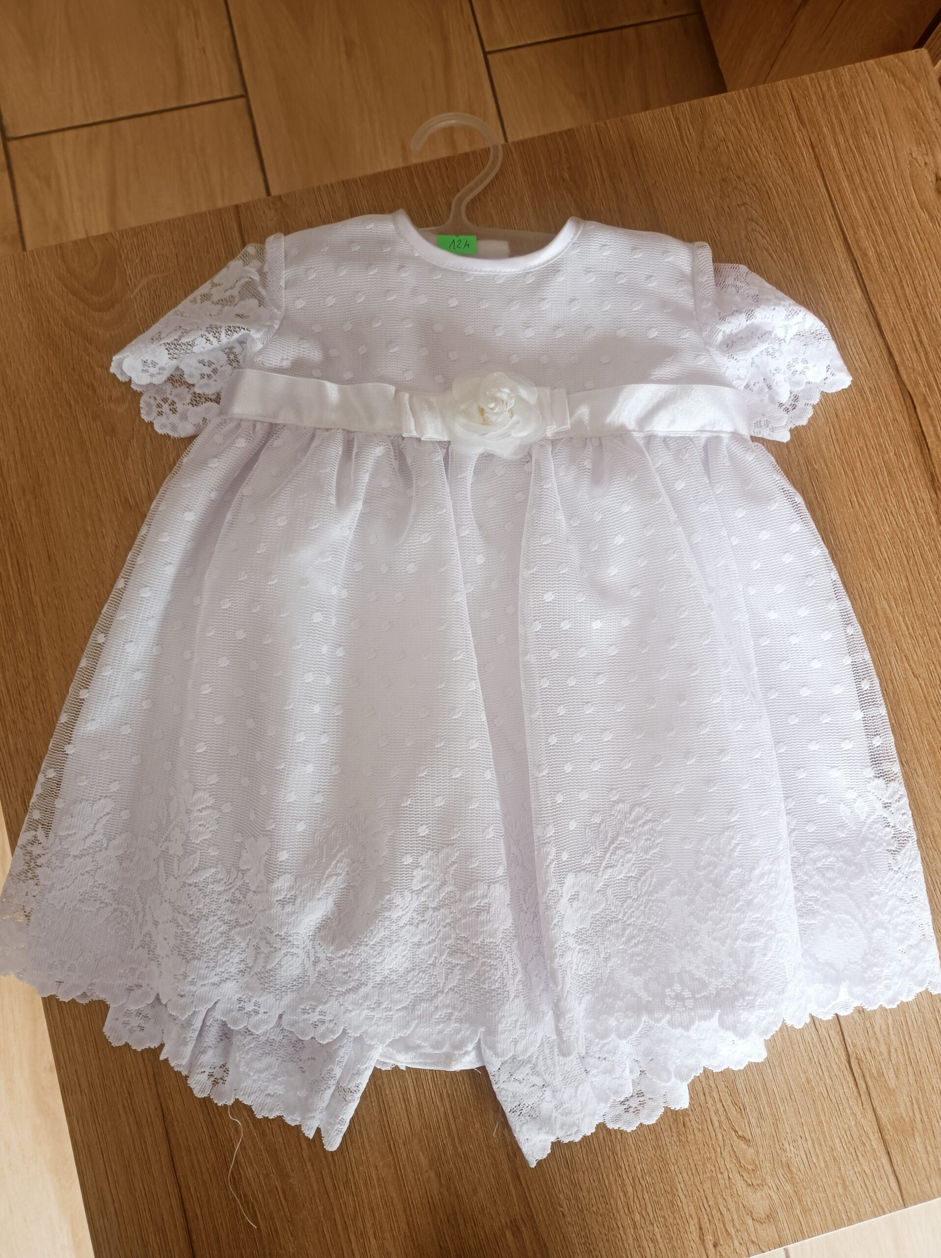 Sukienka jest bogato zdobiona delikatnymi koronkami przy rękawach i na dole.